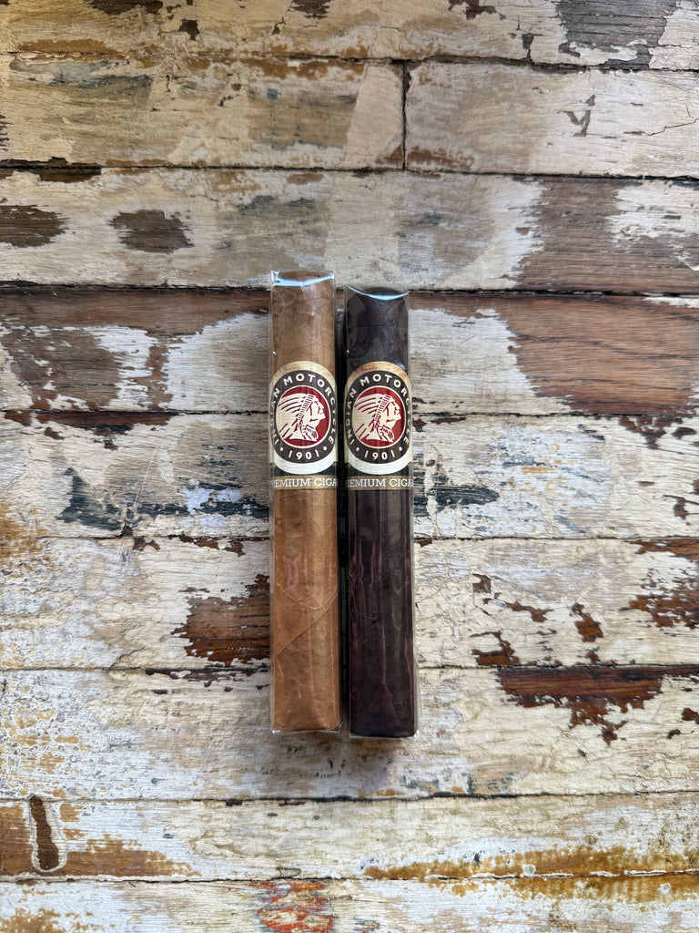 Indian Motorcycle®, America's First Motorcycle Company and Philip S zanghi III have captured the essence of its heritage with a new ultra-premium cigar range. The Indian Motorcycle® Premium Cigars, crafted by 6th generation cigar makers, embody this legacy of quality and craftsmanship. These cigars feature a carefully curated blend of the finest Central American, Dominican, and American tobaccos. This exquisite blend offers a full-flavored, well-balanced smoking experience, reflecting the esteemed reputation of one of today's most revered brands. Includes 1x Shade Robusto, & 1x Maduro Robusto